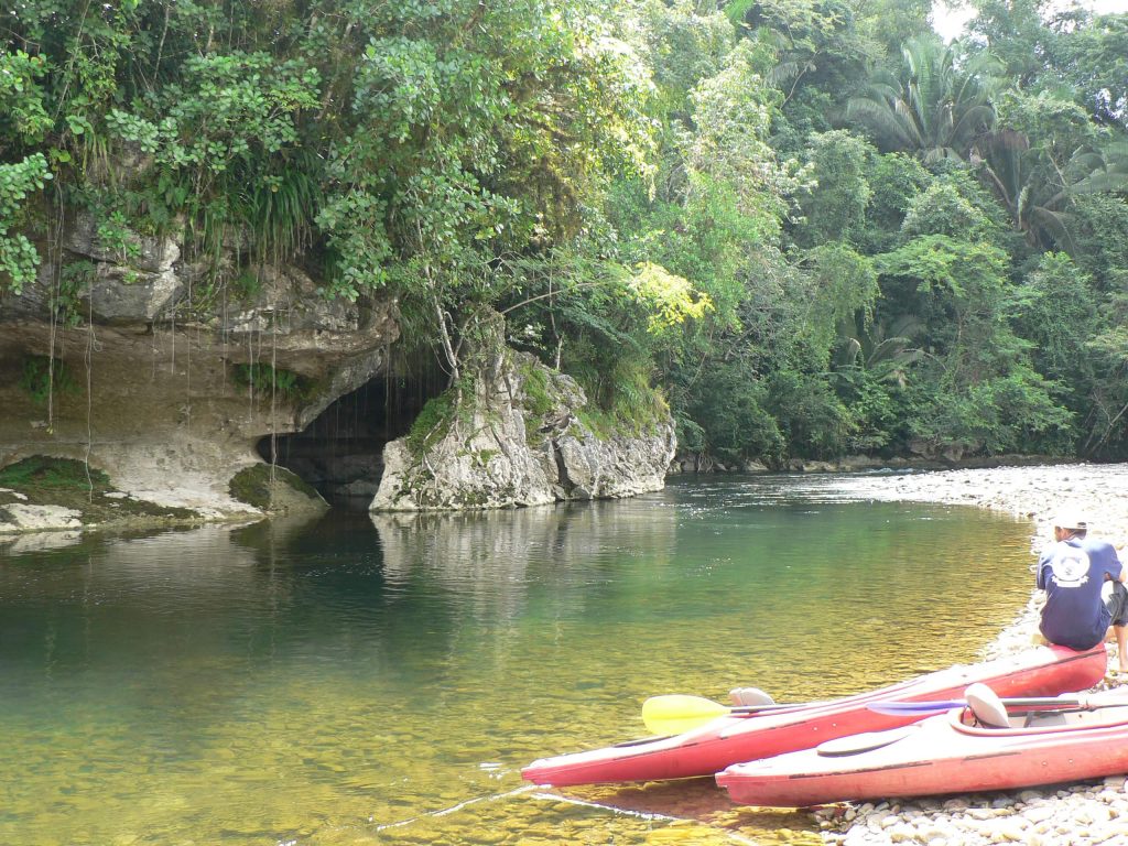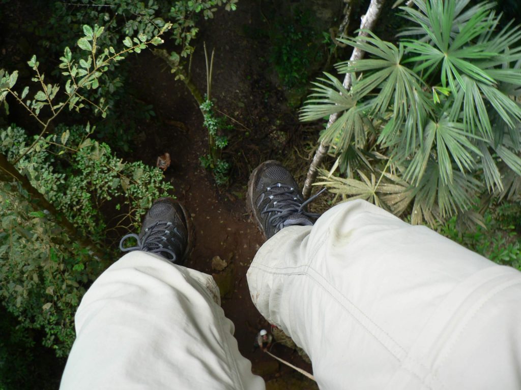 Day 2 of adventures was a little more laid back with an 8 mile kayak down a stretch of river lined by jungle.  Not too strenuous, mind you – more like a lazy float with the whims of the river to spot kingfishers, waterbirds and iguanas sunning themselves on the river banks.  Day 3 was of course the finale with a 100 metre rappel down into a massive sinkhole – to the floor of an enormous old cavern whose roof collapsed in, probably from an earthquake in the past.  What a buzz watching my feet dangling high over the canopy of foliage below, dropping down past cave tunnels and finally putting feet to earth in jungle that has claimed the stalagmites of the old cave floor.  Our voices seemed to echo forever around as we had to climb back up the rim of the sinkhole and retrace our steps out of the jungle.