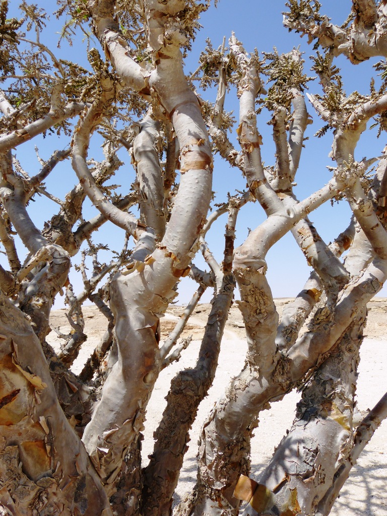 The purpose for my journey to this region is to walk the Frankincense Trail. The heady, aromatic resin from the Frankincense tree (Boswellia sacra) is used as incense, perfume and medicine and its trade flourished in this region for over 3000 years. The most prized Frankincense came from the trees of the Dhofar region of southern Oman.  The straggly trees take root on sheer rock, its bark ragged and peeling, its branches twisted and serpentine. When the trunk is ‘striped’ with a knife the precious milky sap dribbles out drying over a week or more to the brown, yellow or prized green crystals and nuggets.